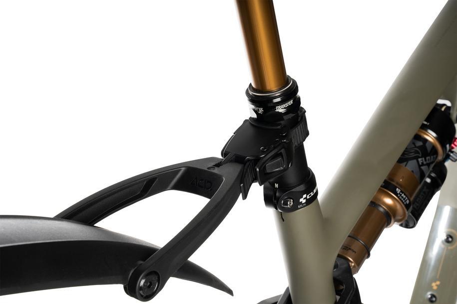 Dzięki sprawdzonemu połączeniu zapadkowemu ACID PRO Vane, umożliwiamy szybki montaż i demontaż. Pasek mocuje się wokół sztycy siodła i zaciska za pomocą dźwigni zapadkowej. Wystarczy nacisnąć przycisk, aby odblokować błotnik, co pozwala kierowcy na szybką i elastyczną obsługę.