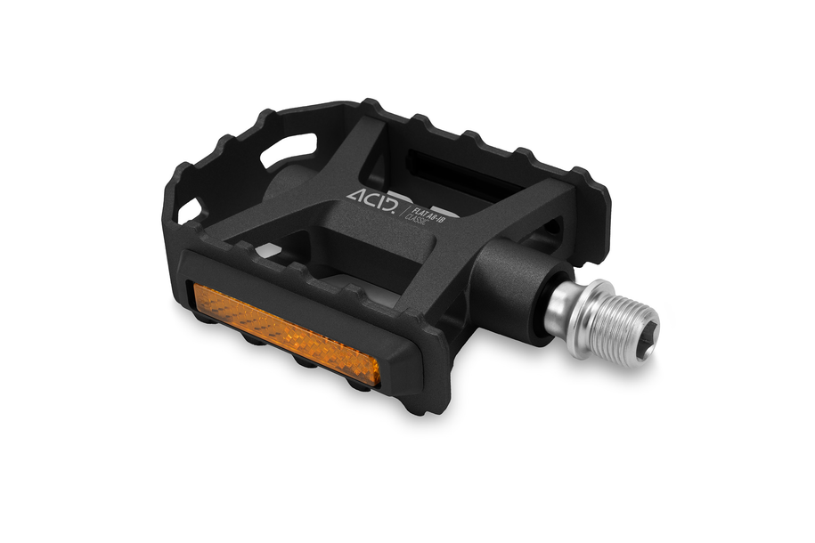 Pedał ACID FLAT A8-IB Classic wyposażony jest w aluminiową klatkę z wbudowanymi sworzniami, zapewniającą pewny chwyt w każdym obuwiu. W połączeniu z klasycznym wzornictwem i srebrną kolorystyką, idealnie pasuje do szerokiej gamy rowerów i każdego rodzaju jazdy. Wytrzymała, obrabiana CNC oś Cr-Mo osadzona jest na uszczelnionym łożysku przemysłowym i tulei LSL, co zapewnia długą żywotność i płynną pracę. Odblaski z certyfikatem StVZO zapewniają zgodność z niemieckimi przepisami ruchu drogowego i lepszą widoczność dla innych uczestników ruchu.